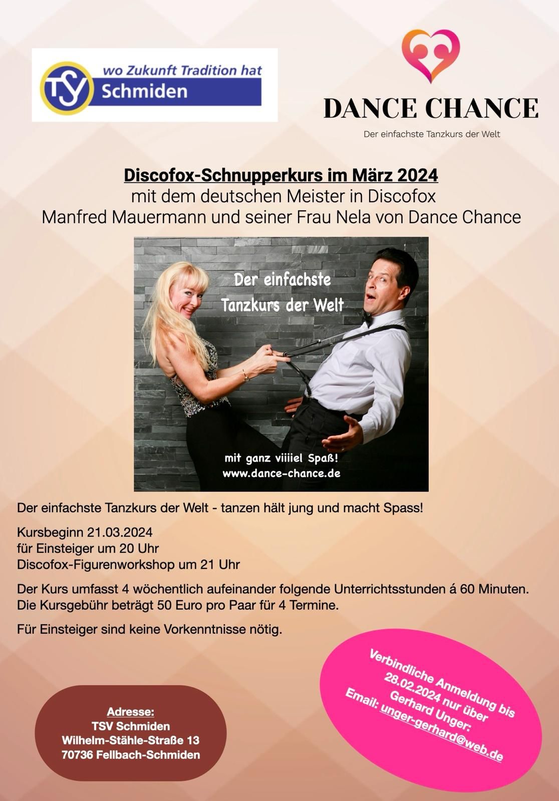 Wir bieten wieder einen Discofox-Schnupperkurs für alle interesierten an. Ab dem 21.03.24 werden an vier aufeinader folgenden Terminen wieder das Parkett zum glühen gebracht. Melden Sie sich schnell bis zum 28.02.24 bei uns an.